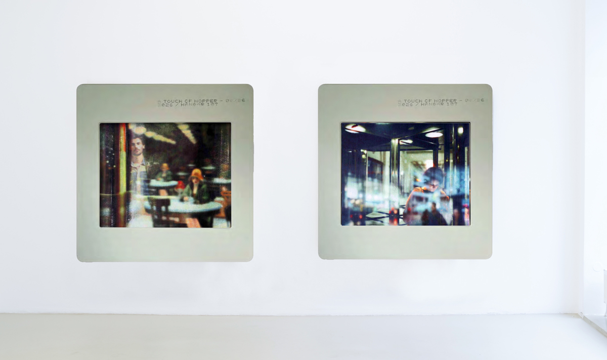 photographic, his works are nevertheless entirely drawn. Blur is neither accident nor effect here, but a deliberate construction resulting from a rigorous manual protocol. For the artist, blur functions as a critical principle. It introduces a perceptual instability that displaces the image from immediacy and engages the viewer in extended duration. Reflections, overlays, and zones of in distinction open a field of interpretation in which seeing is less a matter of recognition than of experience. In A Touch of Hopper, this aesthetic unfolds in narrative form. The exhibition presents itself as a suspended film composed of still images in which figures, isolated in urban space, cross paths without ever truly meeting.