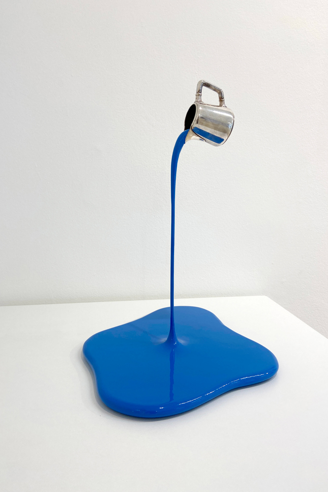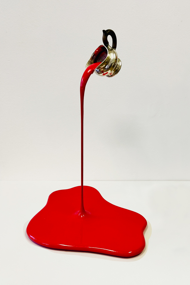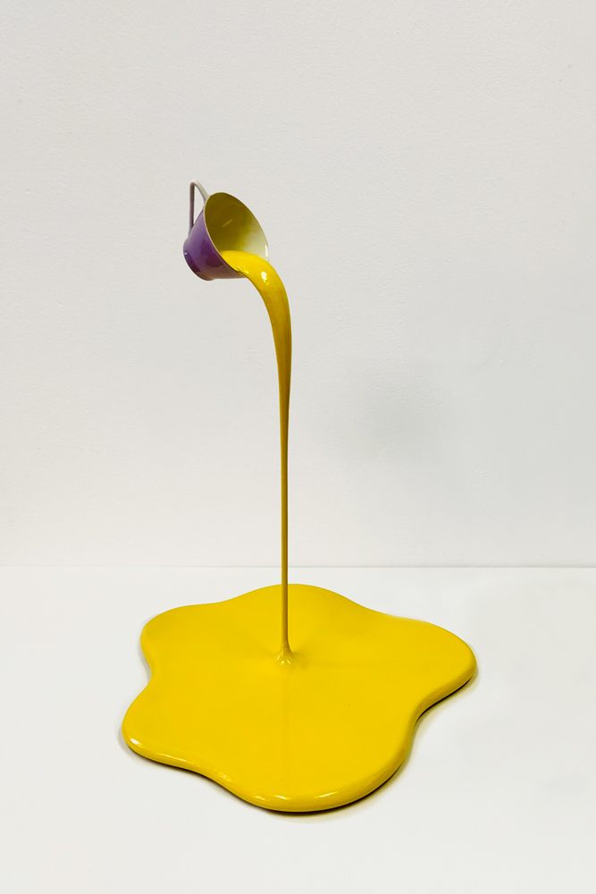 Das Spiel mit Form- und Sinnanalogien sowie ortsbezogene Eingriffe spielen in den Arbeiten von Markus Hofer eine große Rolle. Dabei geht er auf die individuelle Beschaffenheit der Räume ein, egal ob es sich um öffentliche oder private Plätze handelt und bezieht seine Formen aus der vor Ort vorhanden Gegebenheiten. Markus Hofer orientiert sich dabei an kaum wahrgenommenen Gegenständen bzw. dem Inventar des funktionalen Alltags, wie an Heizungsrohren, Steckdosen, Stromkabeln oder Architektur. An der Grenze zwischen Kunst und Alltäglichkeit erzwingen die Skulpturen einen kurzen Augenblick des Innehaltens. Die umgefallene Lackdose wirkt wie ein Malheur, das gerade vor ein paar Augenblicken passiert ist und den vor einiger Zeit erfolgten Umbau und die damit verbundenen Arbeiten im Haus in Erinnerung ruft. Es scheint so, als wenn einer der Arbeiter versehentlich auf dem Gang eine Farbdose umgeworfen hätte. Die Farbe rinnt aus und ergießt sich tropfenförmig auf dem Teppichboden. Die Installation der angehaltenen Farbtropfen, wirkt wie ein angehaltener Moment zwischen einem Davor und Danach und friert den Augenblick des Geschehens ein.